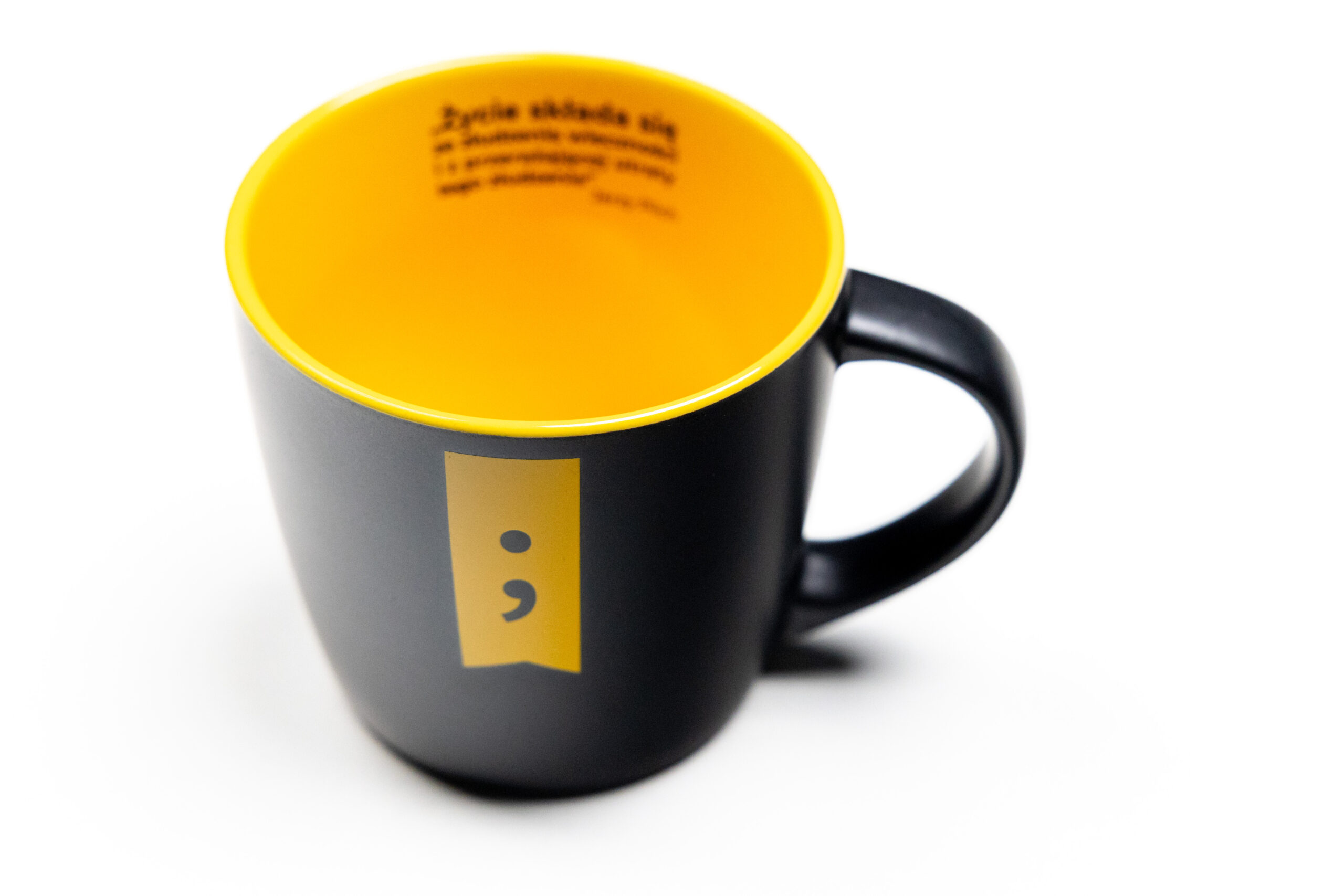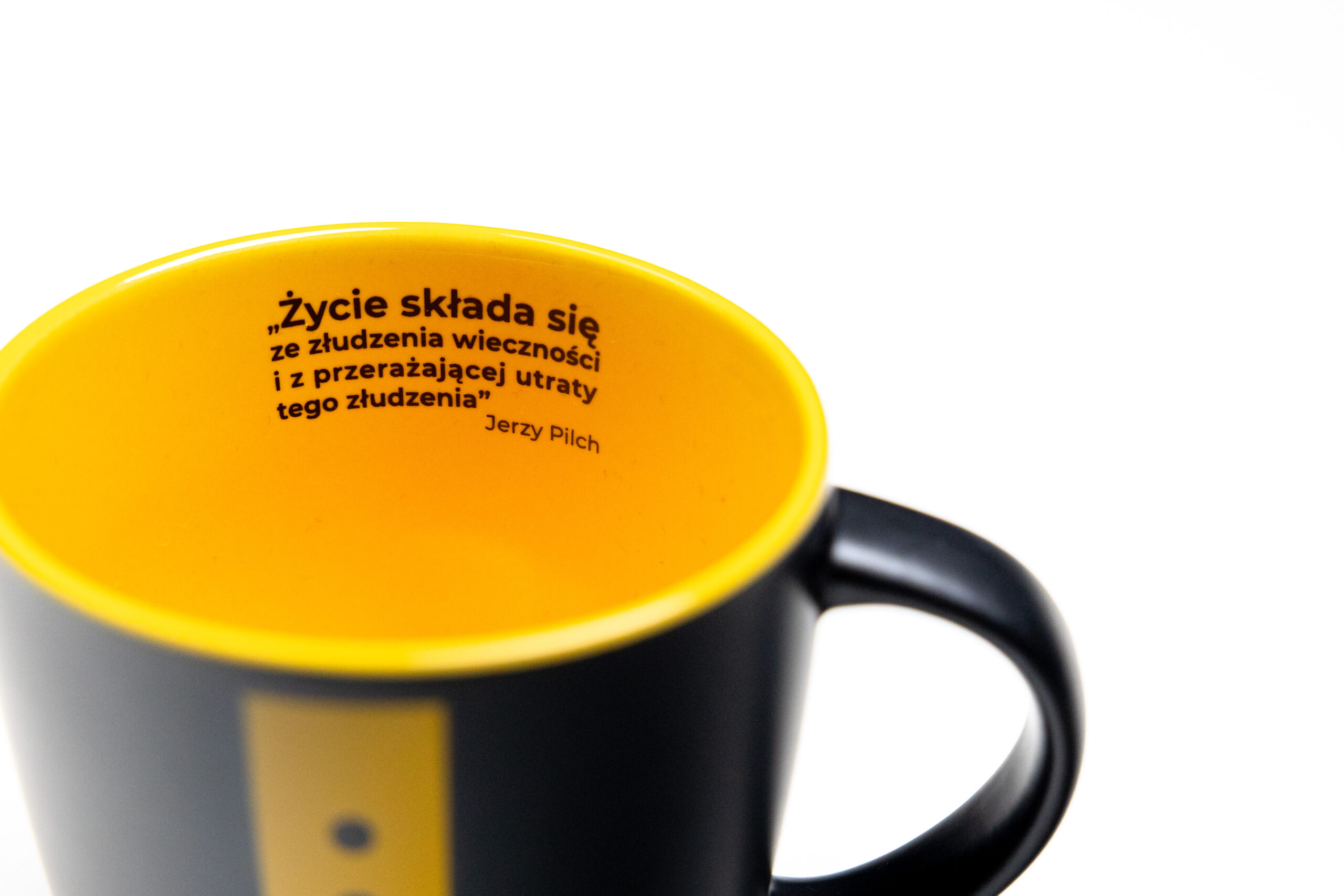 Ceramiczny kubek w kolorze czarno-żółtym z nadrukiem. Pojemność kubka 300 ml.