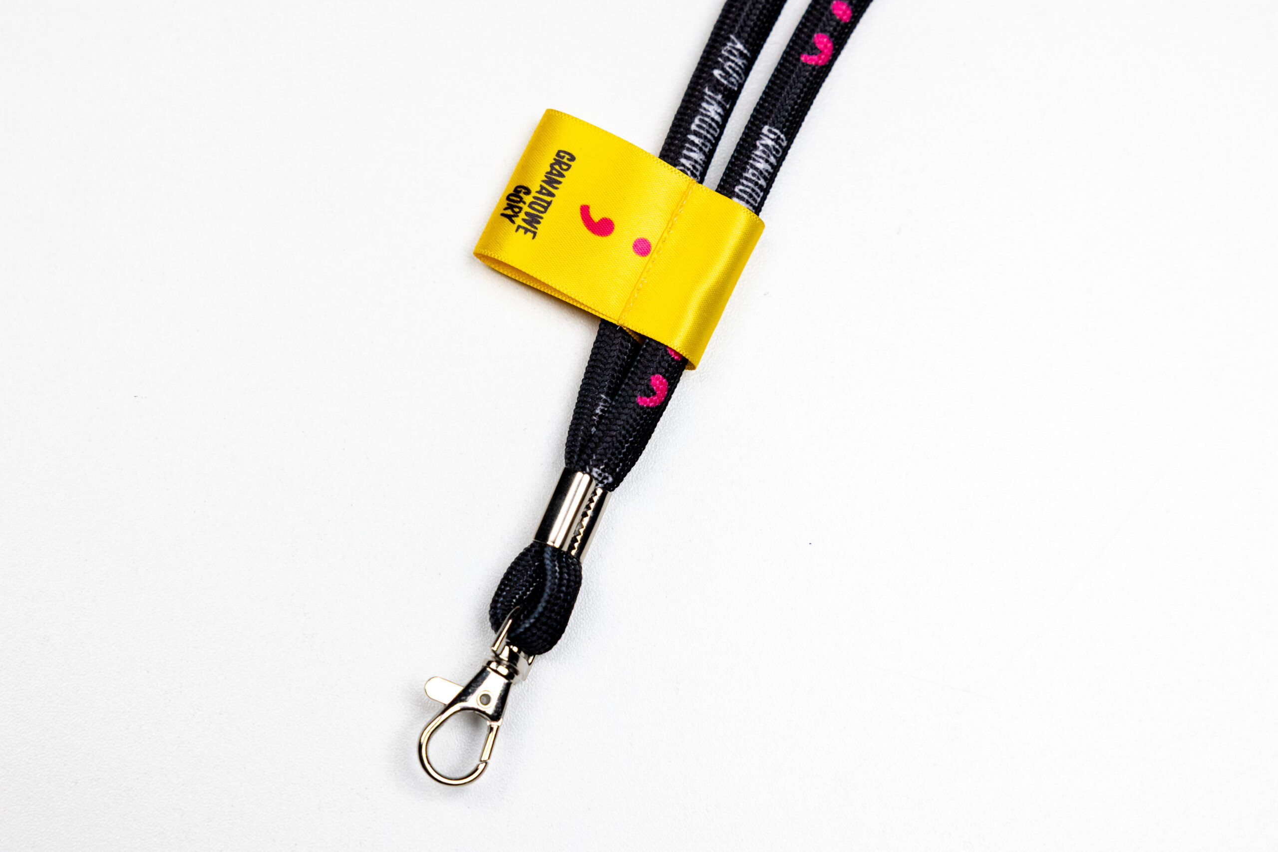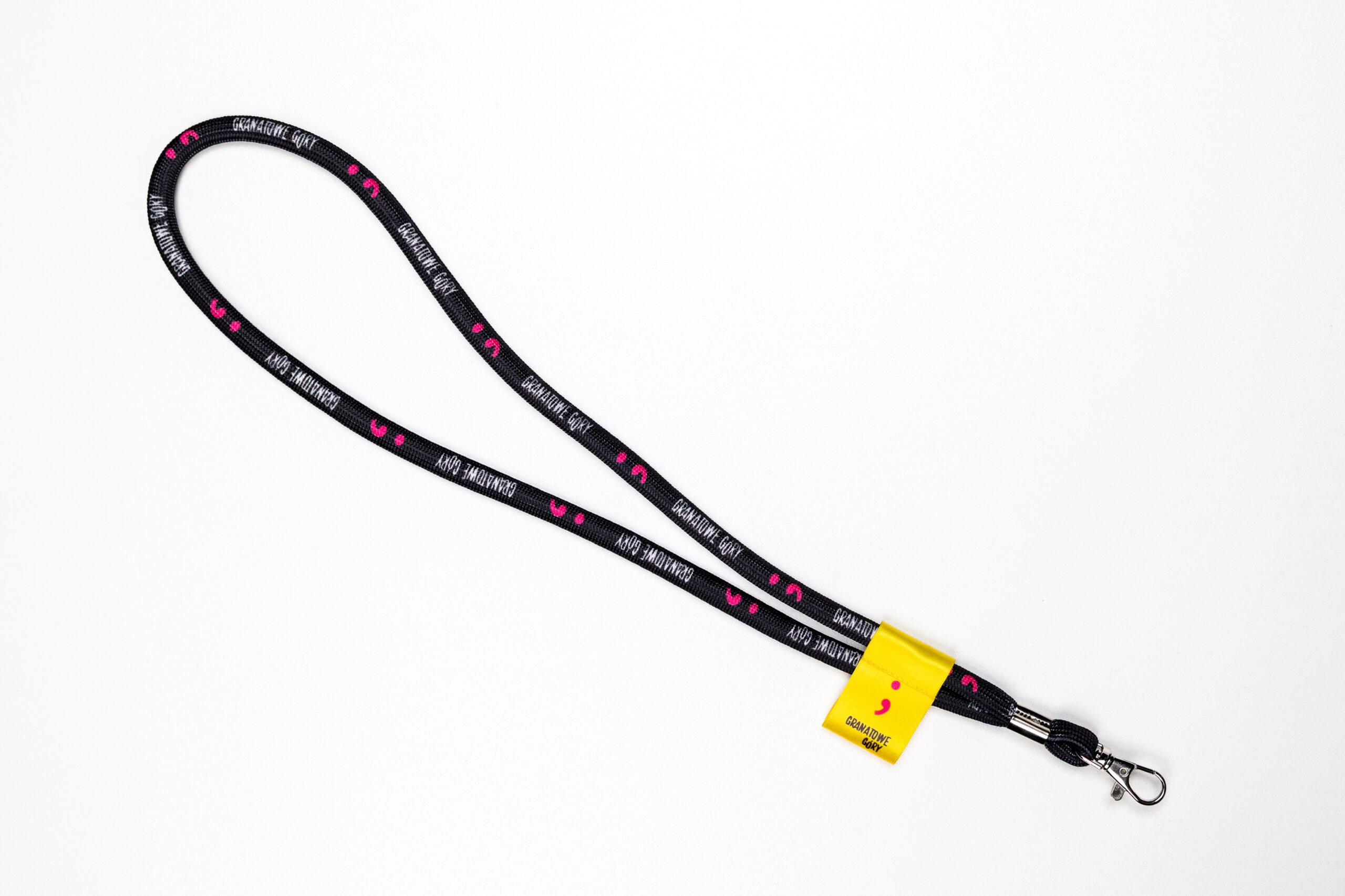 Smycz wykonana jest z taśmy sznurowadłowej wypełniona sznurkiem poliestrowym o średnicy 10 mm. Smycz posiada swój oryginalny okrągły kształt. Zapinana na karabinek.